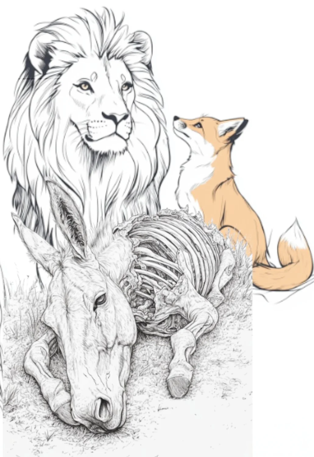 The Fox was well satisfied, but the Lion flew into a great rage over it, and with one stroke of his huge paw, he added the Ass to the pile of slain.