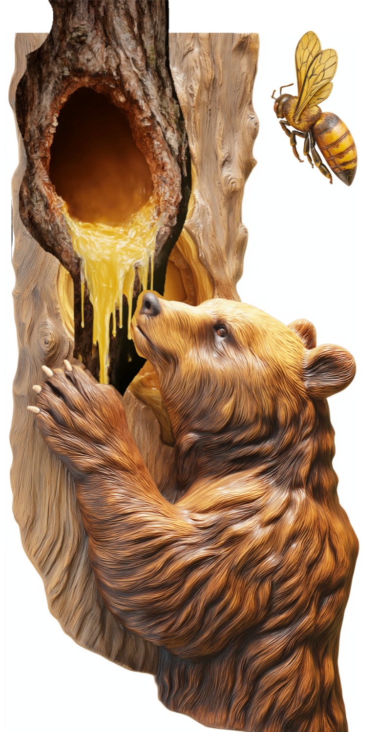 A Bear roaming the woods in search of berries happened on a fallen tree in which a swarm of Bees had stored their honey. The Bear began to nose around the log very carefully to find out if the Bees were at home. Just then one of the swarm came home from the clover field with a load of sweets. Guessing what the Bear was after, the Bee flew at him, stung him sharply and then disappeared into the hollow log.